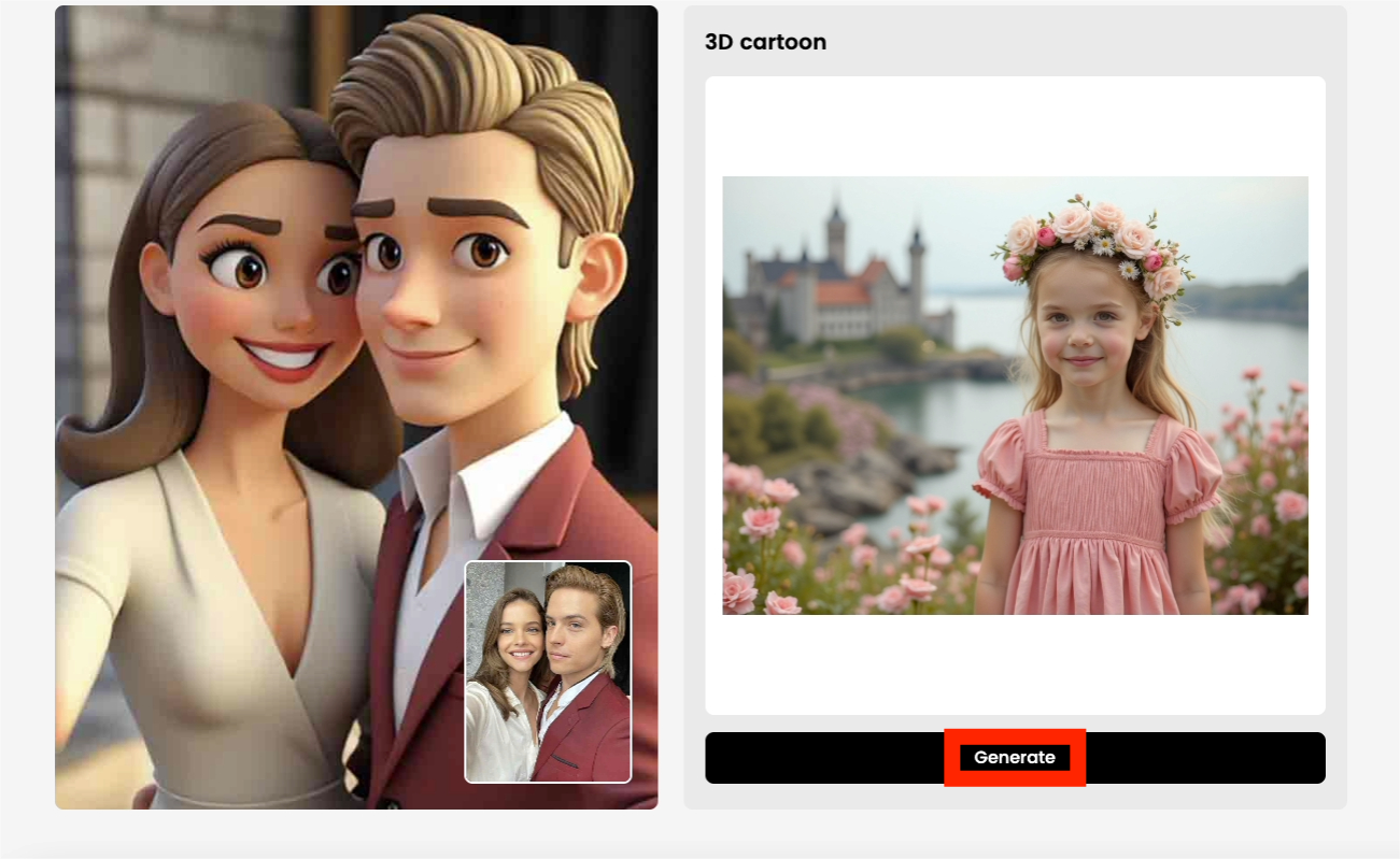 Our free AI 3D Cartoon Generator is your personal digital cartoonist. It uses cutting-edge AI to analyze your photo and apply the signature elements of a 3D cartoon character: cartoonish features, vibrant colors, and a charming cartoon presence. With just one upload, you can generate a high-quality, professional 3D cartoon portrait that captures the essence of a true cartoon star. No design skills needed!