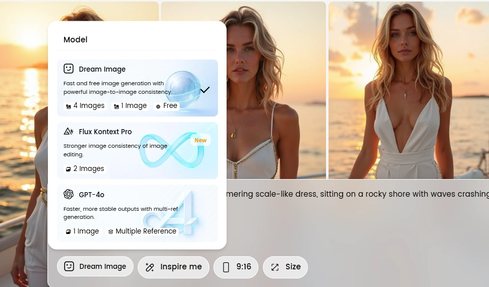 Select the AI model you prefer, such as Dream Image, Flux Kontext Pro, or GPT-4o. Then, choose the image size based on your project’s requirements.