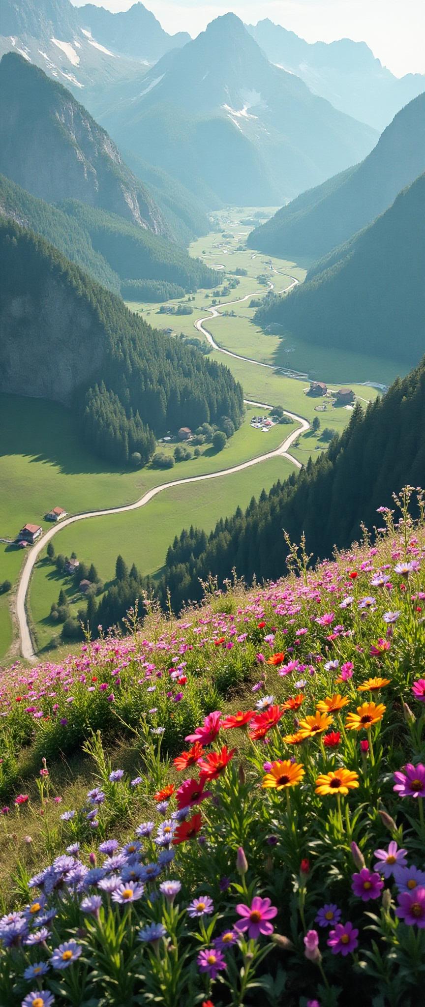 highdefinition images 、wildflower fields in the Austrian Highlands、 Best Picture 、 A plateau with a fresh breeze 、Magical beings and strangely colorful flow