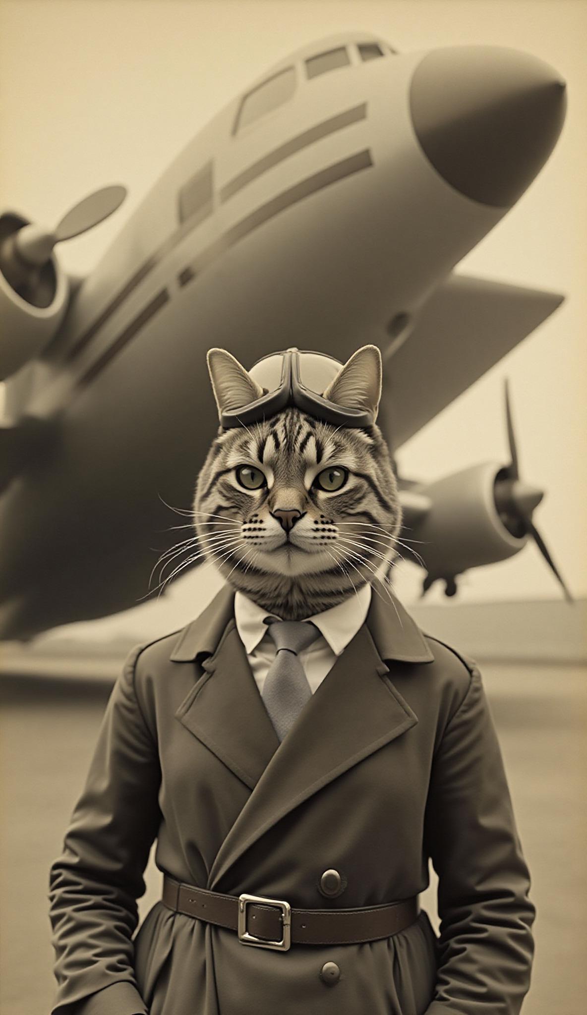 IsabellaA sepia-tinted photograph, a cat dressed as a pilot, standing in front of historical vintage aircraf, tthe Spirit of St. Louis, a nonstop transatlantic flight