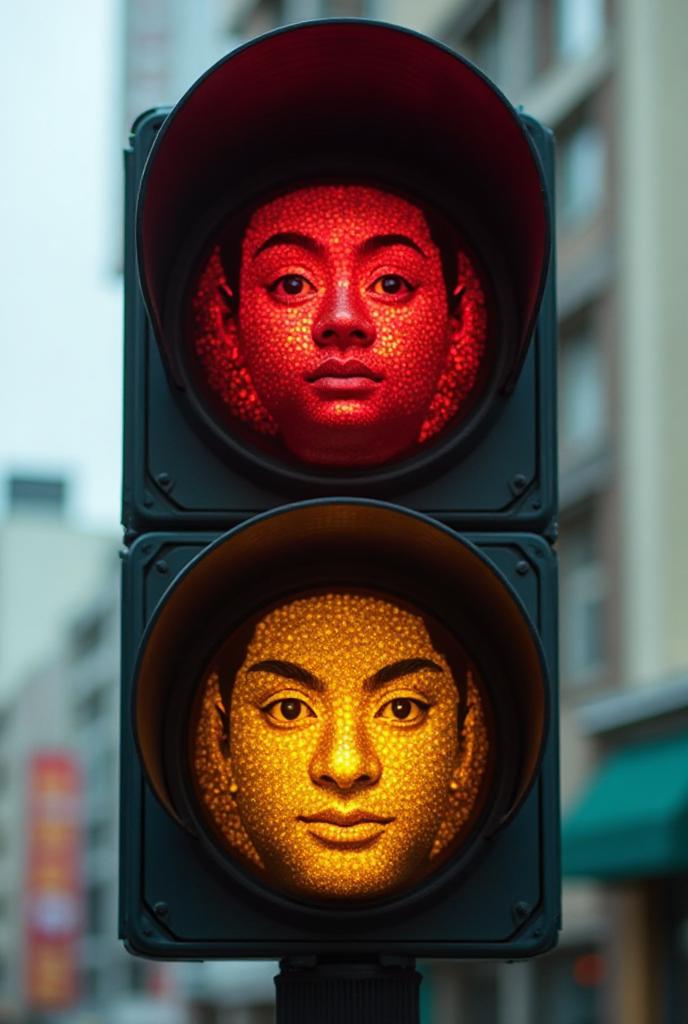A traffic light where the red light is replaced with a close-up of Tanjiro Kamado's face, the yellow light is replaced with a close-up of Zenitsu Agatsuma's fac