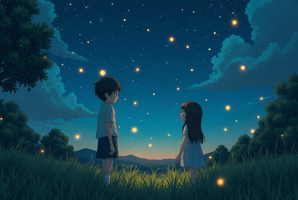 ElijahPhotorealistic 8K quality, hyper-realistic. The theme is "semi-luminescence". Japanese summer countryside idylls. A girl and a boy are watching fireflies. The f