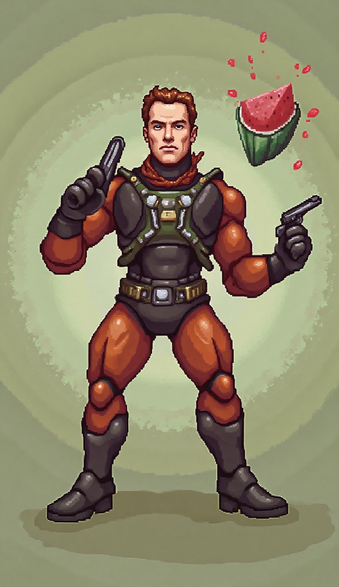 Arnold Schwarzenegger, fruits Terminator, fruits Weapons, , (watermelon bombs blasts:1.8), (Watermelon shaped helmet, strawberry-shaped hand guns:1.8)