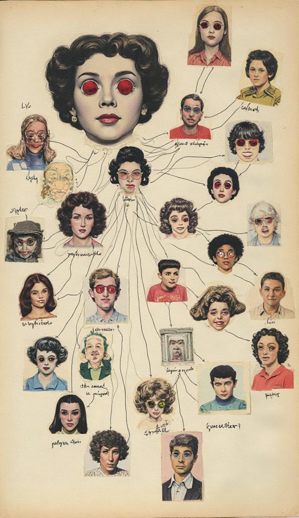 Messy scrapbook mind map: 1970s psychology magazine clippings, faces with replaced eyes (TVs, teacups), string connecting concepts like ‘Love’, ‘Obey’, ‘Product