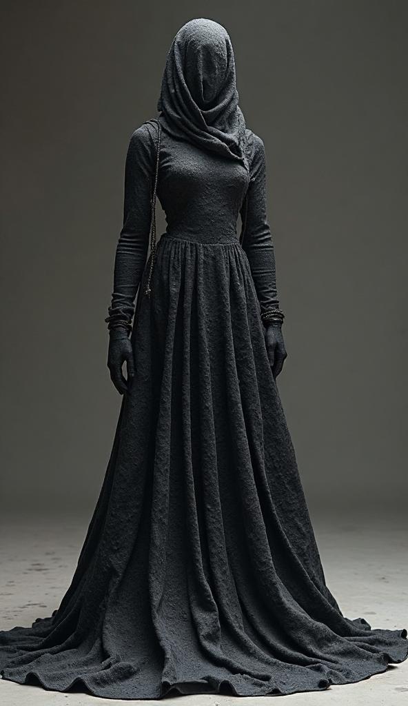 ElizabethA zero-gravity mourning garment designed for orbital funerals, its flowing silhouette woven from carbonized human hair and asteroid-mined palladium threads, emb