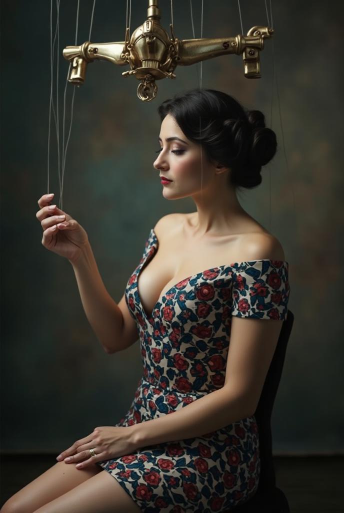 MiaA Puppeteer hands (robot hands) controlling puppets manipulator concept Employer (Gorgeous busty woman, wearing a triangle pattern dress) domination exploitatio