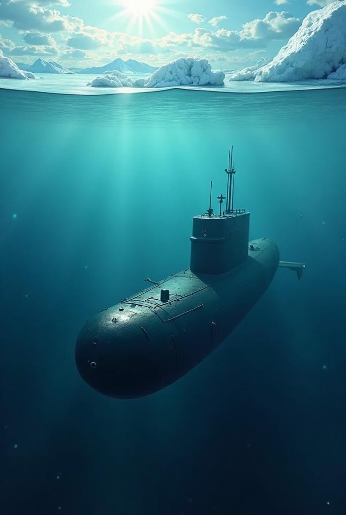 U-boat traveling on the seabed、There is a sea surface above my head and blocks of ice are floating、Light shines on the surface of the sea