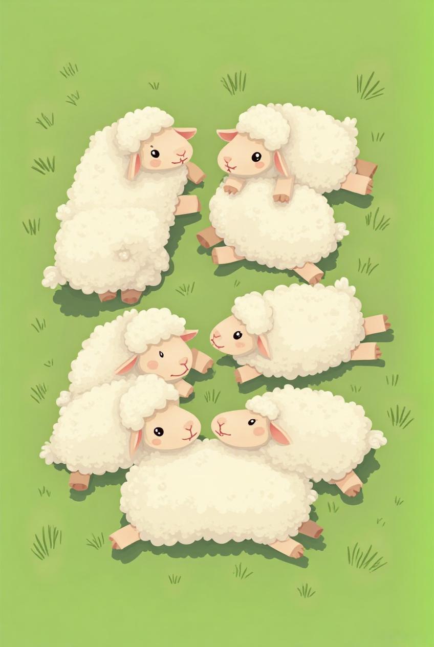 Cute cartoon-style illustration of a flock of fluffy sheep laying on the grass, top view, flat design, vector art, simple details, bold lines and solid colors, simple shapes, minimalism, pastel tones, green background, detailed illustrations, digital airbrushing, hand-drawn animation.