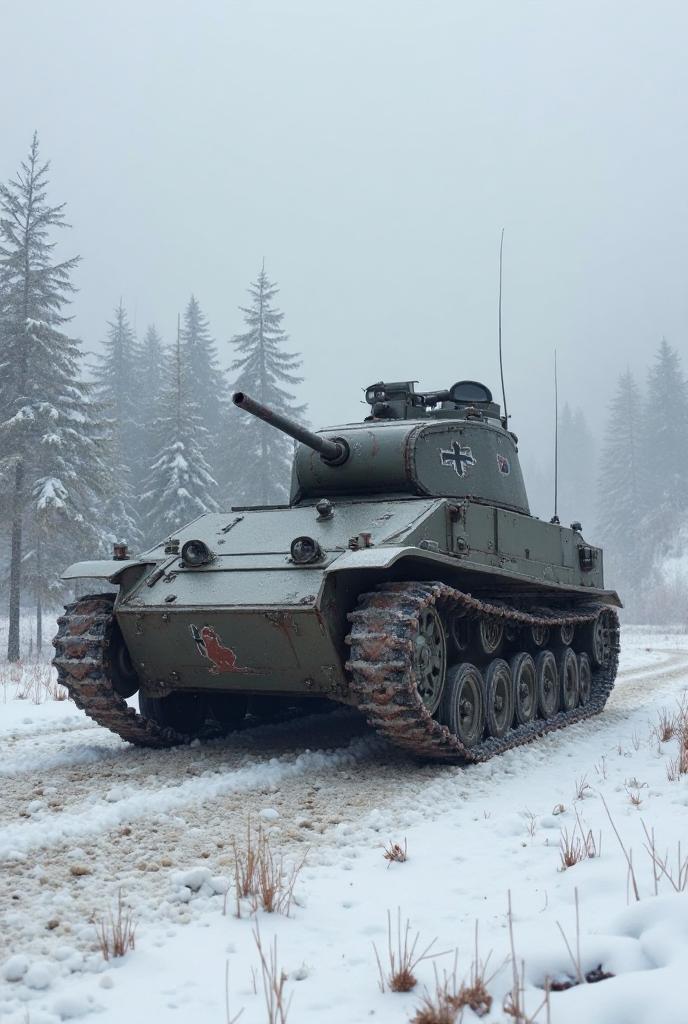 HenryWorld War II、German Army、Light Armor、Panzerkampvagen II、Sd Kfz 251、((It has 6 thin legs、machine legs are like spider legs))、、mountainous region、winter、 Snow M