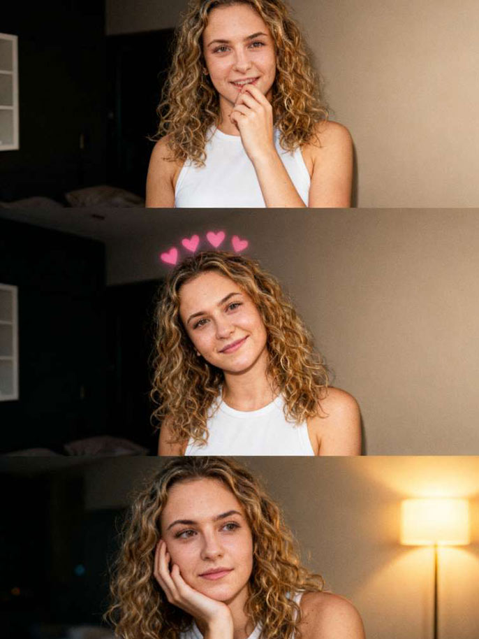 Upload a clear portrait or selfie for the AI to generate a three-shot FaceTime-style sequence.