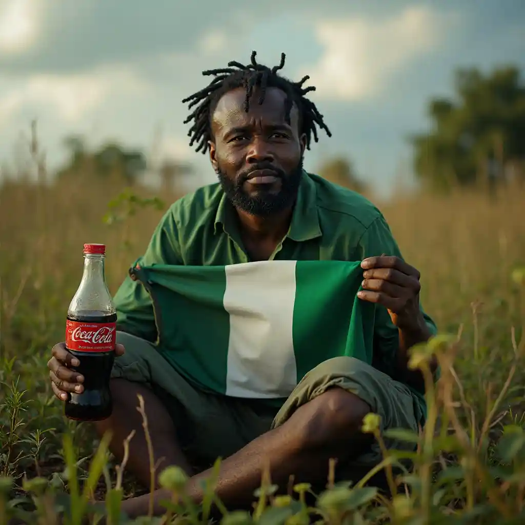 صورة لرجل أفريقي يحمل زجاجة كوكاكولا ويحمل العلم النيجيري ويجلس في الأدغال وهو يبكي. Make is realistic as possible