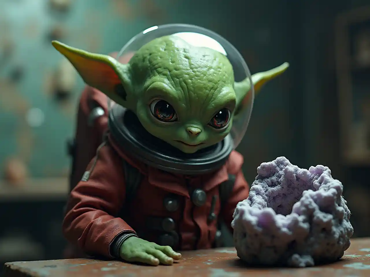 فائقة الواقعية صغير أجنبي عدواني أخضر ، في الحياة الحقيقية ، مع اثنين من الهوائيات مع عين واحدة لكل منهما ، يرتدي رأسه على خوذة كبسولة زجاجية كبيرة ، يرتدي زي رائد فضاء أحمر داكن ، في مختبر قديم ، ينظر إلى صخرة لزجة من geode رمادي أرجواني بجانبه. تحتوي الصورة على إضاءة درامية تؤكد على سلوك الشخصية الكئيب ولكن الجذاب