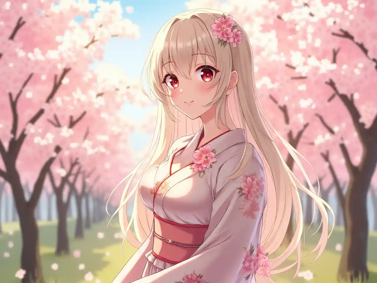 فتاة رسوم متحركة فائقة الدقة مع صورة أفقية واسعة النطاق ، مشعة ومذهلة ، تستحم في الشمس المشرقة ، تقف في بستان أزهار الكرز في الهواء الطلق ، ترتدي كيمونو دقيق مع خط عنق منخفض ، ترتدي أوبي بلون زخرفي ، شعر طويل مزخرف بالزهور وابتسامة ساطعة ، بشرة متلألئة بعيون كبيرة ، لوحة بيضاء وردية ناعمة ، ملامح رائعة ، مكياج مثالي ، جو هادئ ورومانسي ، توهج ناعم وإضاءة طبيعية ، تبرز صدرها الأنيق والمنحرف والانقسامات الدقيقة ، إلى جانب ساقيها الطويلتين والمتناسقتين مع لفتة أنيقة تنضح بالجمال والسحر.