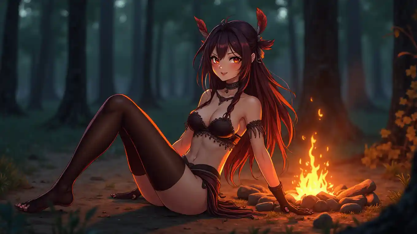 فتاة أنمي Ultra HD مع صور أفقية واسعة النطاق ، جمال ساحر واستفزاز ، تستحم في ضوء نيران المخيم ، تجلس في الهواء الطلق في الغابة المفتوحة في الليل ، ترتدي ملابس على الطراز القبلي ، رقبة عميقة وجوارب عالية الفخذين ، شعرها الطويل مزينة بالريش والابتسامات المثيرة ، عيون كبيرة متألقة ، بشرة متوهجة ، لوحة ألوان دافئة من البرتقالي والبني ، ملامح ناعمة ، مكياج جريء ، جو جامح وغامض ، توهج ناعم في الإضاءة الدافئة ، تسليط الضوء على إغراء لها ، والصدر منقوش مع الانقسامات خفية ، وساقين طويلة منغم في وضع مريح ، يشع الإغراء والقوة.