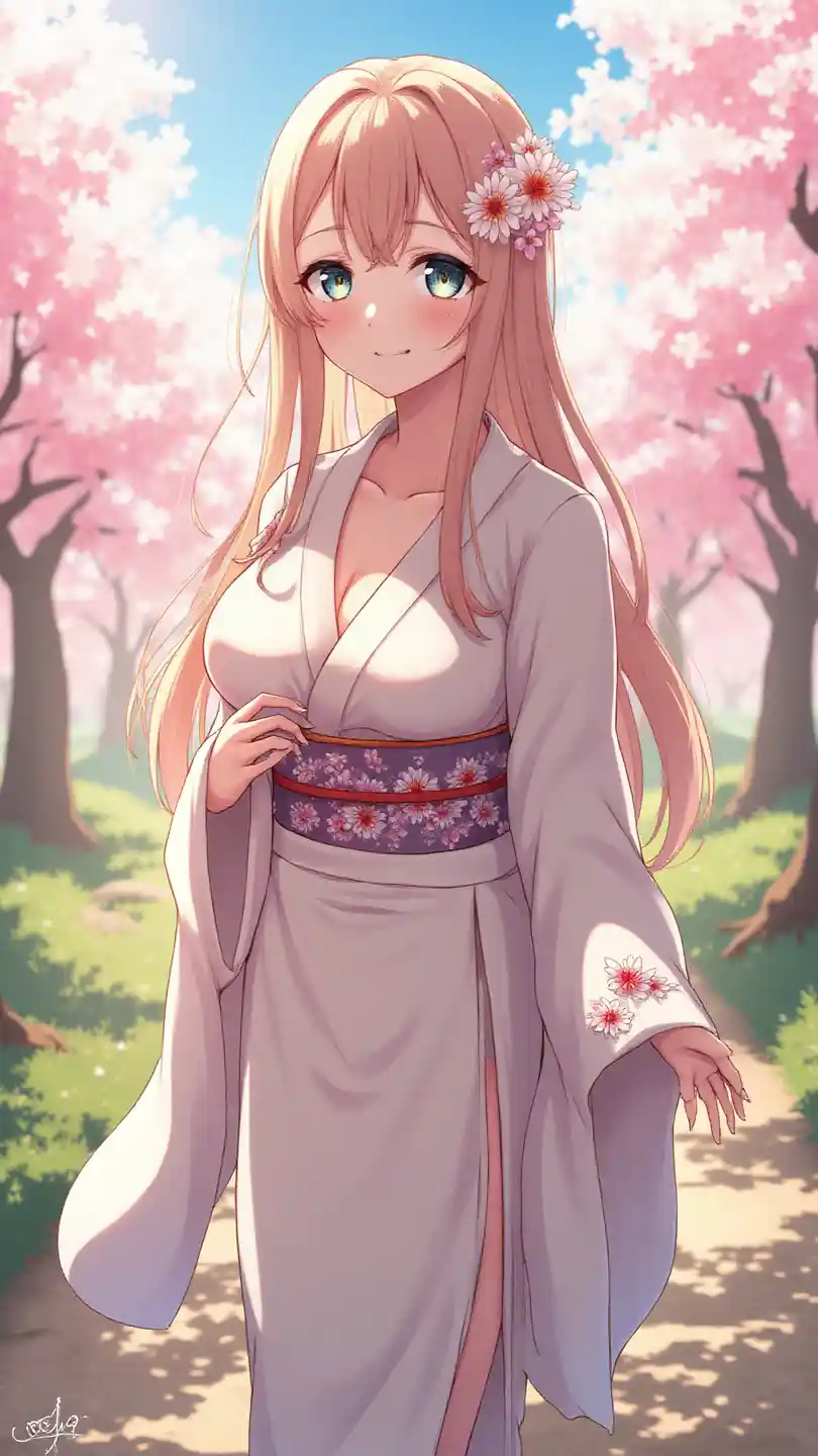 فتاة أنمي فائقة الدقة مع صورة عمودية واسعة النطاق ، رائعة وهادئة لالتقاط الأنفاس ، مشمسة في الشمس المشرقة ، تقف في بستان أزهار الكرز في الهواء الطلق ، ترتدي كيمونو دقيق مع خط عنق منخفض ، ترتدي أوبي منقوش ، شعر طويل مع الزهور وابتسامة متألقة ، بشرة متألقة مع عيون كبيرة ، لوحة بيضاء وردية ناعمة ، ملامح رائعة ، مكياج مثالي ، جو هادئ ورومانسي ، تألق ناعم وإضاءة طبيعية ، تبرز صدرها الأنيق والمنحرف والانقسامات الدقيقة ، إلى جانب ساقيها الطويلتين والمتناسقتين مع لفتة أنيقة تنضح بالجمال والسحر.