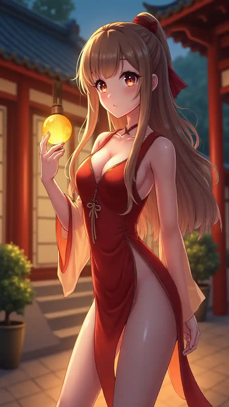 فتاة أنمي فائقة الدقة مع صورة عمودية واسعة النطاق ، جميلة وحسية مشعة ، مضاءة بضوء الفانوس ، تقف في الفناء الصيني التقليدي في الداخل في الليل ، هانفو مكشوفة بخط عنق عميق وعبر الأكمام ، شعر طويل مزخرف بعصا وابتسامة دافئة ، عيون كبيرة متلألئة ، بشرة متوهجة ، لوحة ناعمة من الذهب الأحمر ، ملامح أنيقة ، مكياج مثالي ، جو هادئ ورومانسي ، إضاءة دافئة مع توهج ناعم يسلط الضوء على إغرائها ، الصدر المنقوش مع الانقسامات الدقيقة ، فضلا عن الساقين طويلة ومنغم ، مع موقف هادئ ، يشع سحر والأناقة.