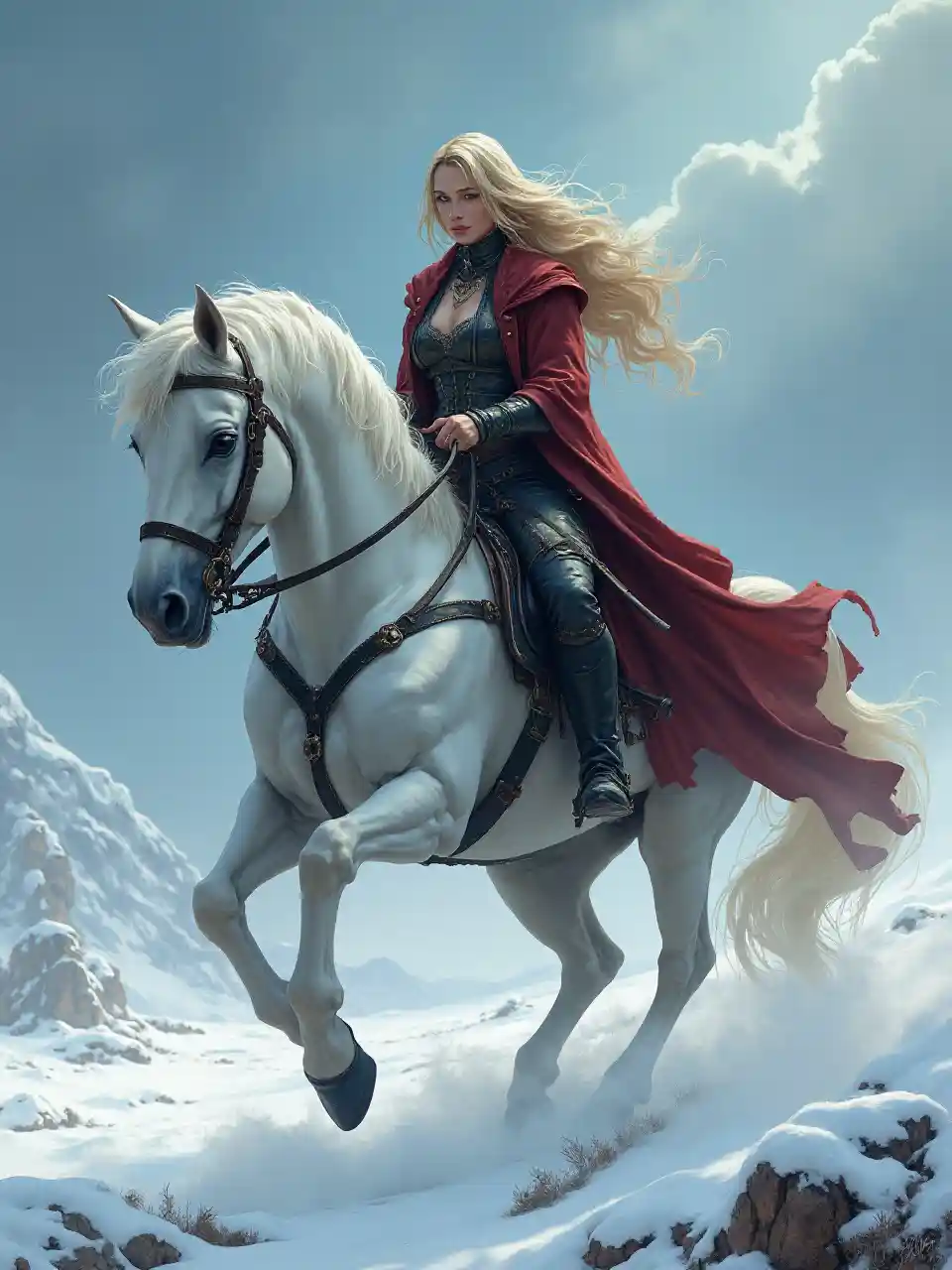 امرأة على ظهر حصان أبيض في حقل مغطى بالثلوج مع سيف في يدها ، آن ستوكس ، فن الخيال ، فن الشخصيات الخيالية الملحمية ، فن السايبربانك