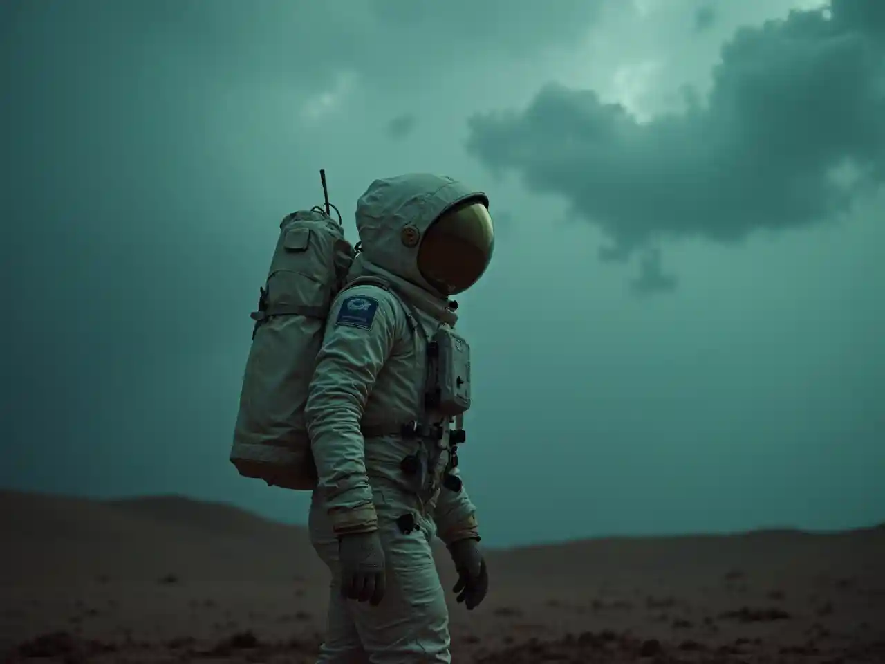 لقطة من الفيلم ، صورة لرائد فضاء ، عاصفة رعدية استوائية ، نيلي فاتح وبيج داكن ، نغمات الباستيل