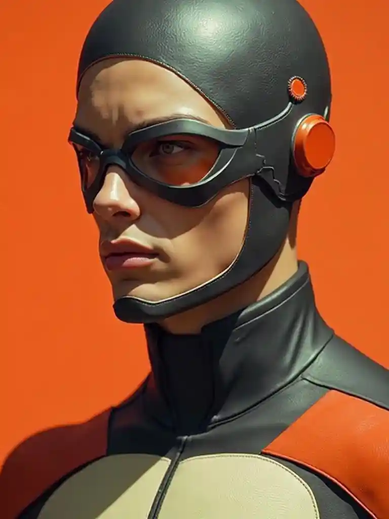 Jocelynصورة واقعية عن قرب لبطل خارق بأسلوب باوهاوس - يرتدي البطل بدلة أنيقة وبسيطة مع أنماط هندسية ولهجات أساسية (