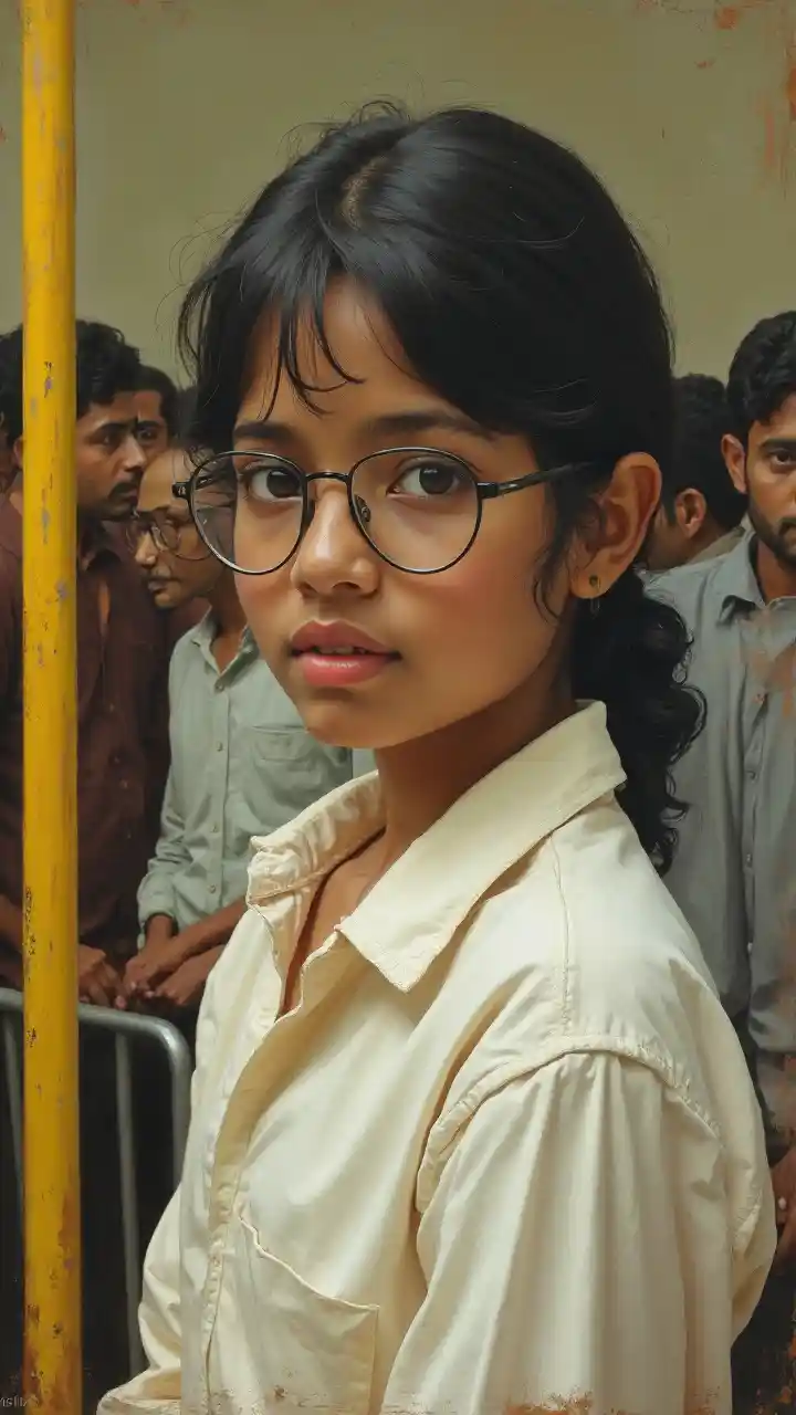 Emmaفتاة ترتدي نظارة وقميصا أبيض في منزل مع أشخاص في الخلفية ، قطب أصفر ، بيكاش بهاتاشارجي ، معهد الفنون البنغالي ، f/32 ، صورة