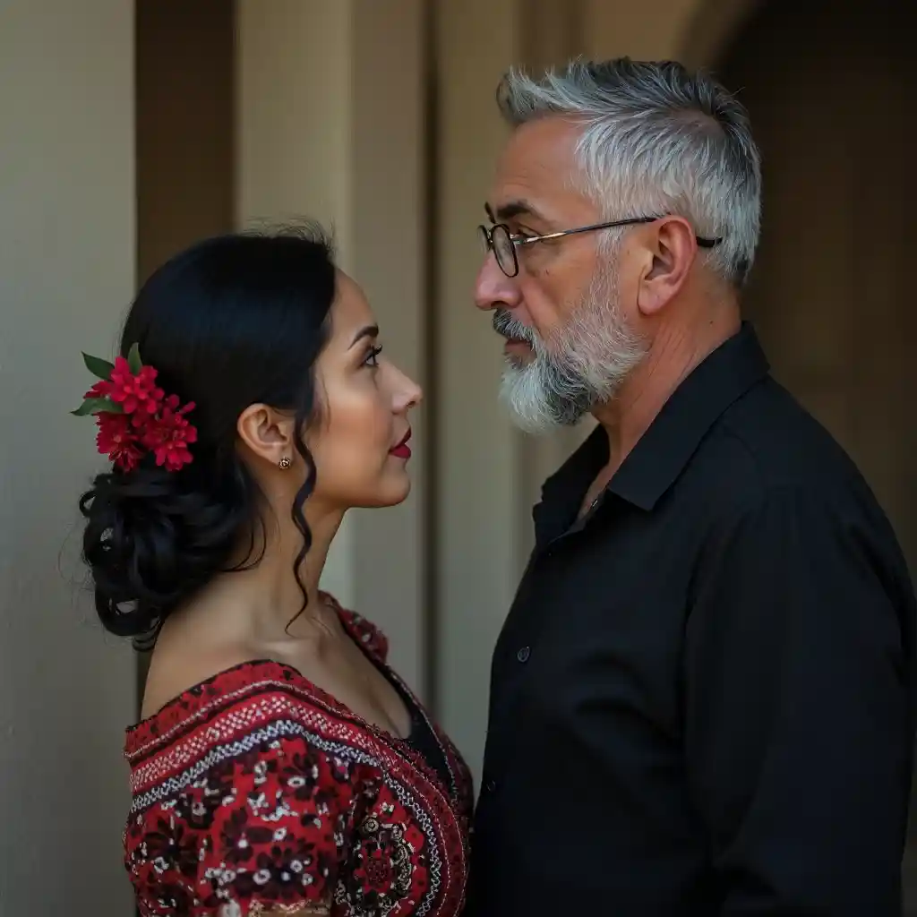 امرأة سمراء بالزي التقليدي المكسيكي تنظر إلى الرجل ذو الشعر الرمادي يرتدي ملابس سوداء بالكامل وينظر إلى بعضه البعض من بعيد