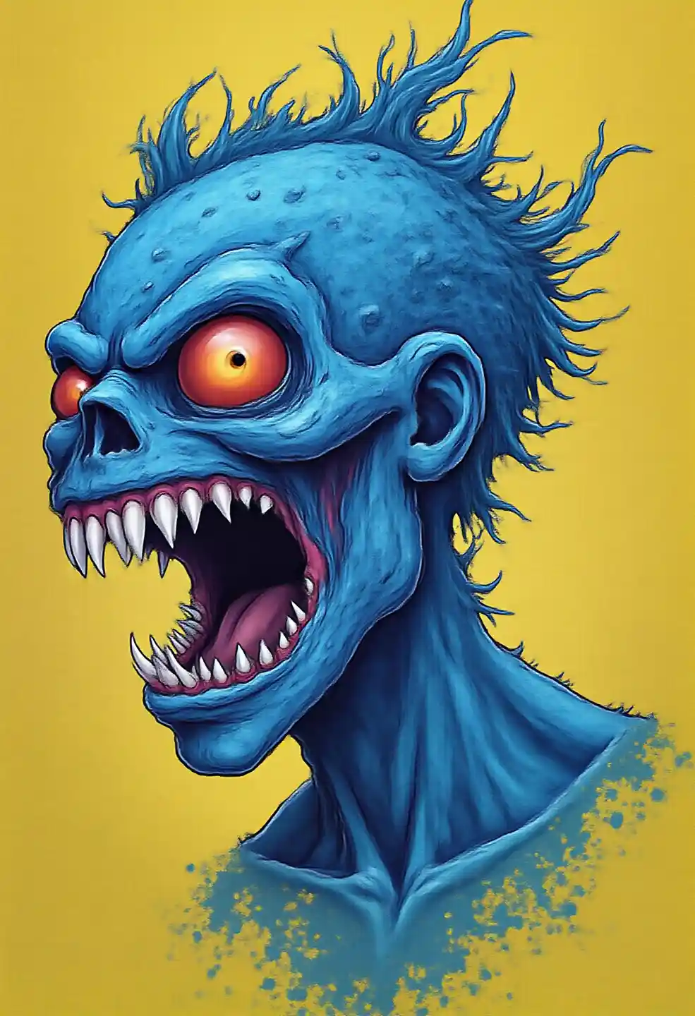 نسيج ملونة مجردة زومبي أزرق أزرق مخنث ، أصباغ زيتية صفراء على الوجه والشعر ، ضربات قذرة لامعة ، ابتسامة سامة ، لسان أزرق حاد ، ز حاد