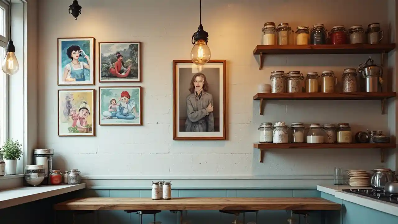 جدران مقهى مريحة تتميز بالصور والرفوف الملونة