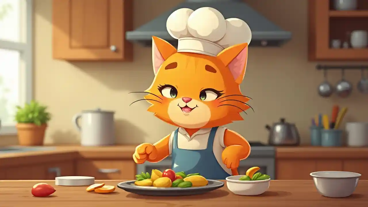 قطة كرتونية برتقالية ترتدي قبعة الشيف وتحيط بمئزر تطبخ في المطبخ.