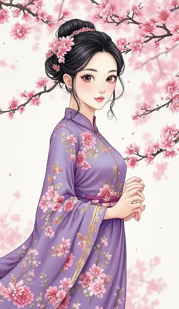 (اللون الأرجواني ساكورا تنورة البورسلين المرأة: 1.5) ، تفاصيل مصورة ، جميلة جدا لالتقاط الأنفاس ، التفاصيل خط الفن ، فائقة الجودة ، مدفون في تشي