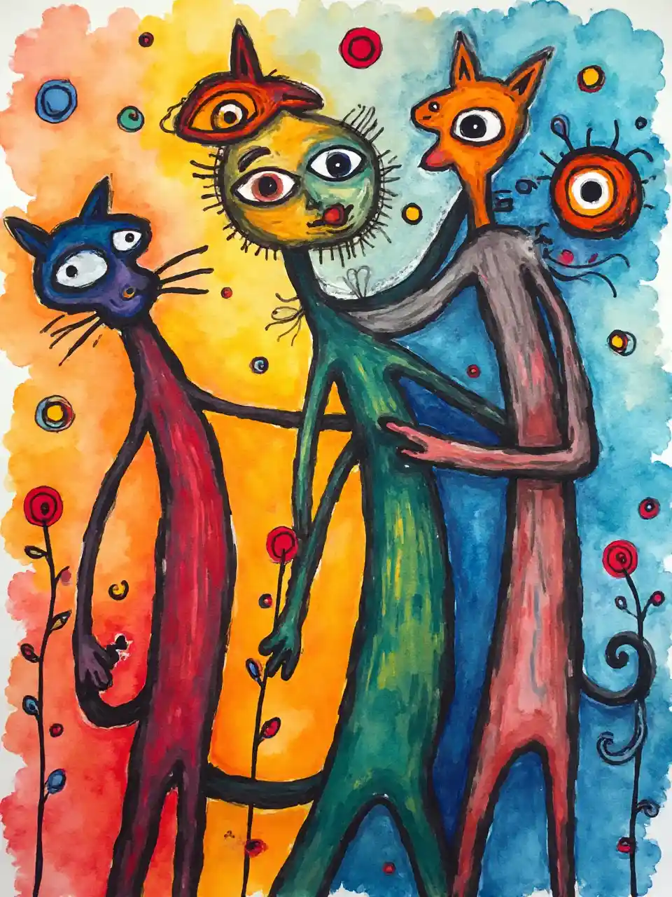 خلفية بساطتها ، لوحات التكعيبية ، لوحات بالألوان المائية ، متعددة الألوان ، أشكال مختلفة ، غير متناظرة ، خطوط منحنية سوداء ، عيون كبيرة نازحة ، قطة نحيلة عالية ترقص ، وجه غير متماثل ، رأس متداخل ، أسلوب بابلو بيكاسو. شرح مفصل لدوامة غبار كانديلاند العجائب بألوان زاهية