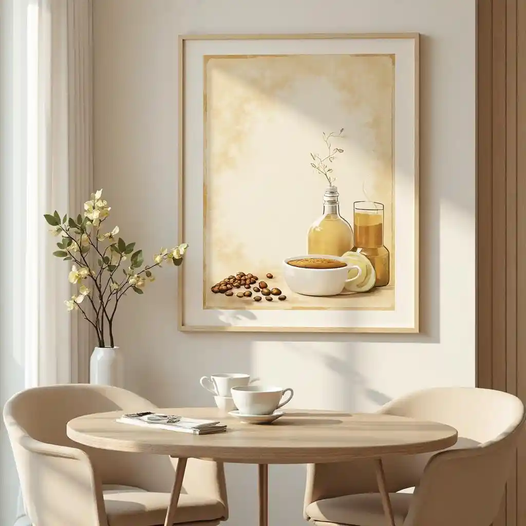 إنشاء أعمال فنية للإطارات الزخرفية ، والتي يتم وضعها في المناطق المشتركة من المباني التي يمكن للسكان الإعجاب بها. يجب أن ينقل العمل الفني الراحة والوضوح والرقي ، باستخدام ظلال ناعمة ودافئة مثل البيج والبني الفاتح والزيتون الأخضر ، مع لمسة ذهبية. يتضمن عناصر بصرية تستحضر تجربة القهوة والنبيذ ، مثل أكواب النبيذ المنمنمة ، وحبوب القهوة ، والأكواب مع البخار الدقيق ، وأوراق الروطان أو أغصان الزيتون. يجب أن يكون النمط عصري وبسيط ، مع خطوط أنيقة ، مما يخلق إحساسًا بالانسجام والرفاهية.