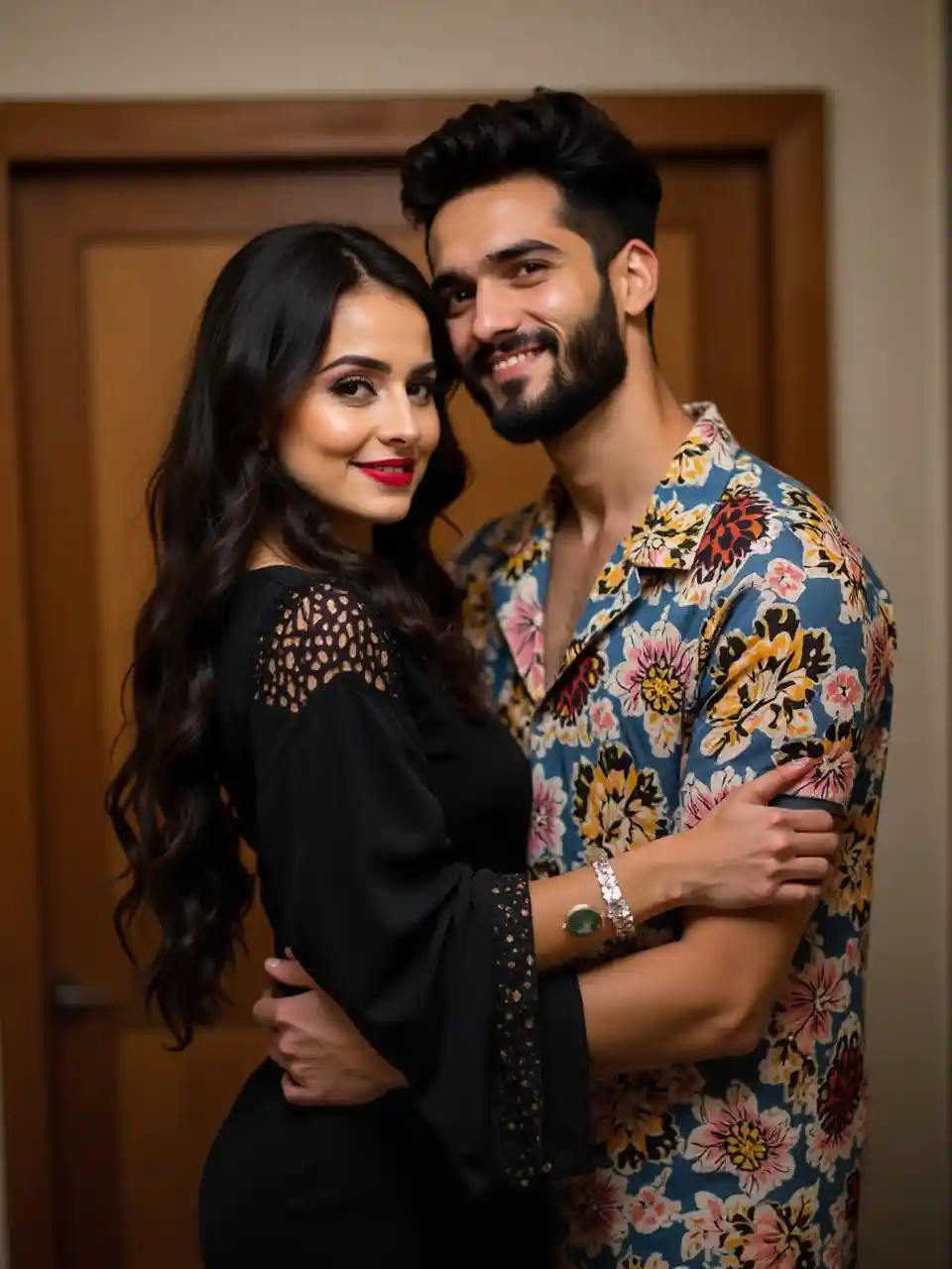 في بيئة داخلية مريحة ، يقف الزوجان معًا في وضع حنون يشع الدفء والاتصال. وأطلت المرأة ببدلة باللون الأسود ، مع تفاصيل معقدة على الأكمام ، مستعرضة شعرها الأسود الطويل وأحمر الشفاه الأحمر الجريء ، على عكس ملابسها الجميلة. وارتدت الرجل من جانبها بلوزة بأكمام قصيرة بألوان زاهية ، مزينة بنقوش مجردة ، ولحية معدلة بعناية ، لتنقل أجواء من الكاجوال والأزياء. وتعكس تعبيراتهم الفرح والحميمية أثناء تفاعلهم مع العدسة ، مع وجود باب خشبي في الخلفية يضفي لمسة من الترابية على المشهد ، وهو ما تعززه الإضاءة المحيطة الناعمة. يلتقط المزاج العام لحظة من الفرح المشترك والالتقاء ، مما يجعل المرء يشعر بالشخصية والجاذبية على حد سواء.