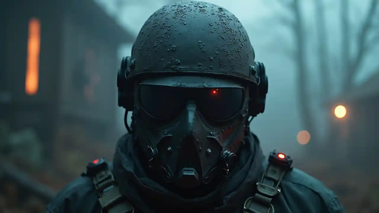 صورة لمحارب Cyberpunk عسكري في البرية الشاسعة ، مظلمة ، عميقة ، مرعبة ، واقعية للغاية