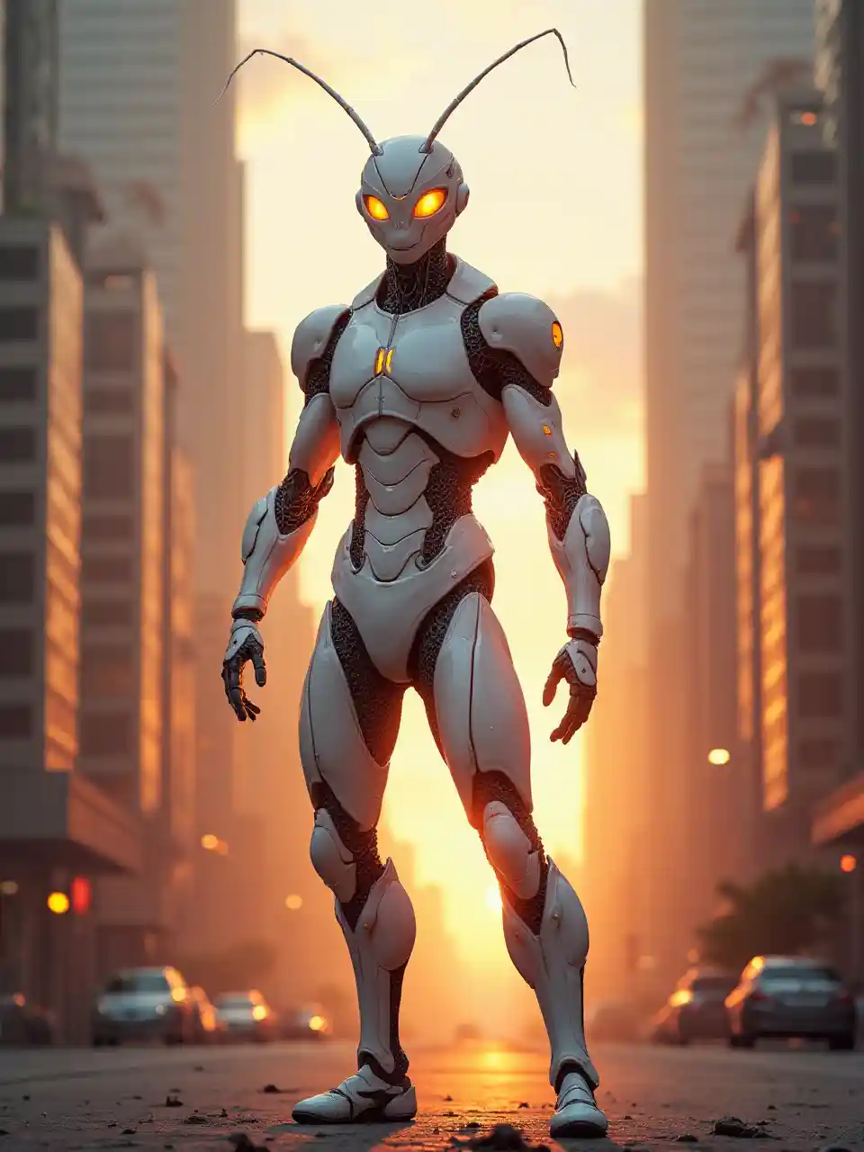 النمل الناري في ملابس بيضاء لامعة شبه روبوتية يقف بين ناطحات السحاب عند غروب الشمس