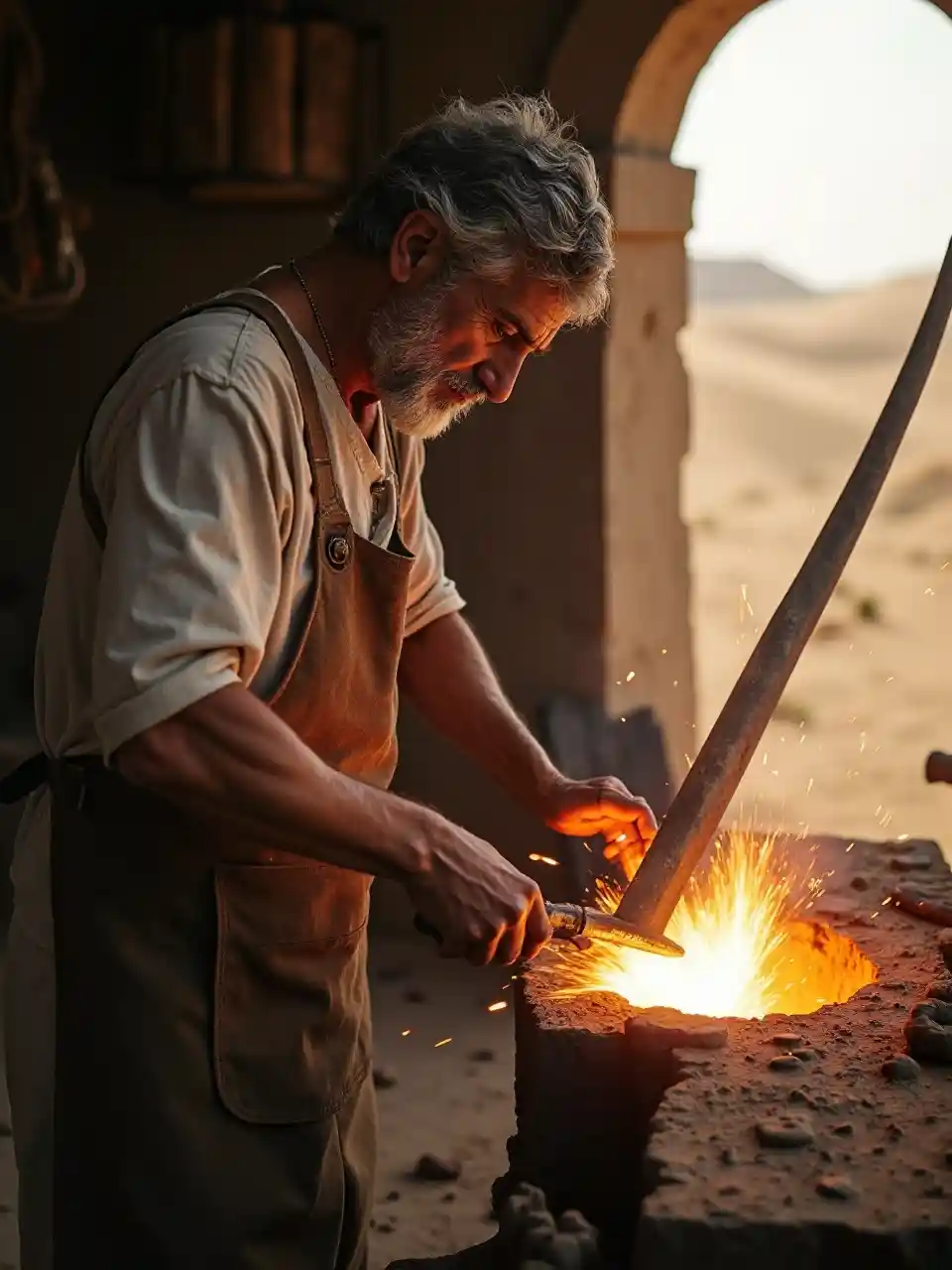 تزوير سيف في مصنع تزوير الصحراء ، رجل شرق أوسطي في الخمسينيات من عمره يتألق في مئزر من الجلد. تتطاير الشرارة ، وتلوح الكثبان الرملية في الخارج ، ويداه الممتلئتان بالرياح والصقيع والتركيز القوي يشع قوة أبدية وسيطرة يدوية.