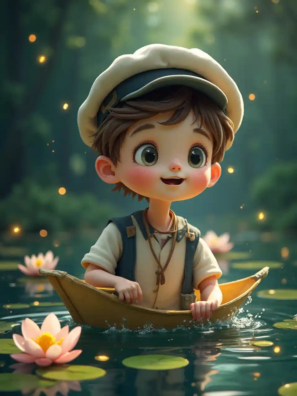 كان هناك قارب ورقي يبحر في مجرى متلألئ ، وكان صبي أبيض يبلغ من العمر 7 سنوات مع النمش يرتدي قبعة بحارة وصدفية. تأطره اليراعات وزهور اللوتس ، وتبعث دفعاته اللطيفة مغامرات فضولية وهادئة في بيئة طبيعية حالمة.