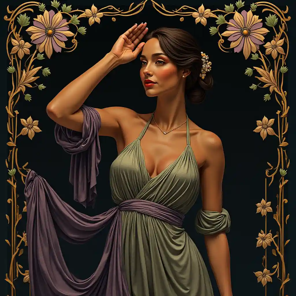 هذه الصورة هي قطعة فنية تتميز بصورة امرأة ذات بشرة بنية اللون ، مع وضعية ديناميكية وسلسة. تم تصويرها على أنها ترفع يدها اليسرى برشاقة إلى جبهتها ، وتغطي عينيها. كانت هادئة وعيناها مركزة. وطلت بفستان مطوي يبرز قوامها بشكل أنيق ، بأقمشة غنية ذات ملمس منسدل حولها. يتم إثراء لوحة الألوان بالألوان الأرجواني والأخضر والذهبي ، وتتناسب النغمات مع النغمات الدافئة لبشرتها وملابسها. الخلفية مظلمة ، وتقدم تناقضات حادة ، وتؤكد على الشكل. حول الشخصيات المركزية هي عناصر زخرفية رائعة على طراز الفن الحديث ، بما في ذلك أنماط نباتية منمنمنمة وأنماط معقدة ، كرنفال نيو أورليانز في مطلع القرن. هذه العناصر تؤطر العمل الفني وتضيف صفاته الزخرفية الأنيقة. بشكل عام ، يتميز هذا العمل الفني بخطوط جميلة وألوان متناغمة ، كما أن أوضاع وملابس الشخصيات سلسة. إنه مثال كلاسيكي للفن الحديث ، مع التركيز على الجمال والطبيعة والأشكال المنمنمة