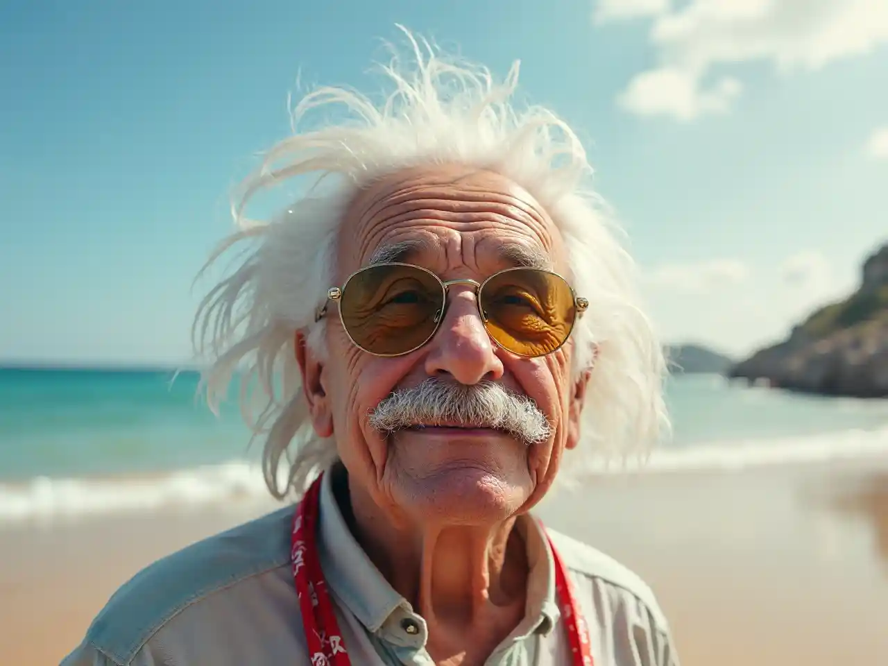 ألبرت أينشتاين يرتدي نظارات شمسية على الشاطئ
