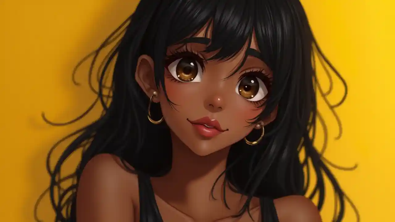 بشرة بنية لطيفة بنات بني عيون طويلة شعر مستعار أمامي أسود طويل رموش طويلة أقراط تنحني إلى الوراء على الأصفر