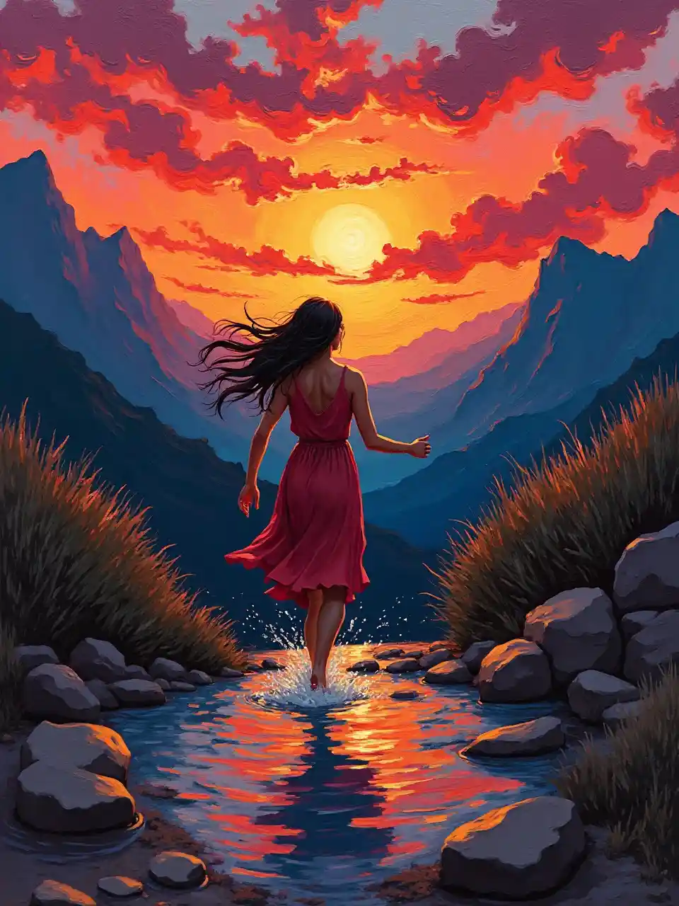 Image @ ar 16:9 @ zoom 1.5 @ style expressive @ v 5 الرسم الزيتي ، النمط التكعيبي ، الصورة الملحمية ، امرأة سعيدة تعمل من البئر عند غروب الشمس ، الإضاءة الطبيعية ، HD ، أفضل جودة ، ألوان زاهية ، تفاصيل حادة ، تقنية impasto ، قماش ملمس ، ظلال دراماتيكية ، خطوط متدفقة ، أشكال مجزأة ، مناظر طبيعية جبلية ، ظلال من الأحمر الداكن والأرجواني