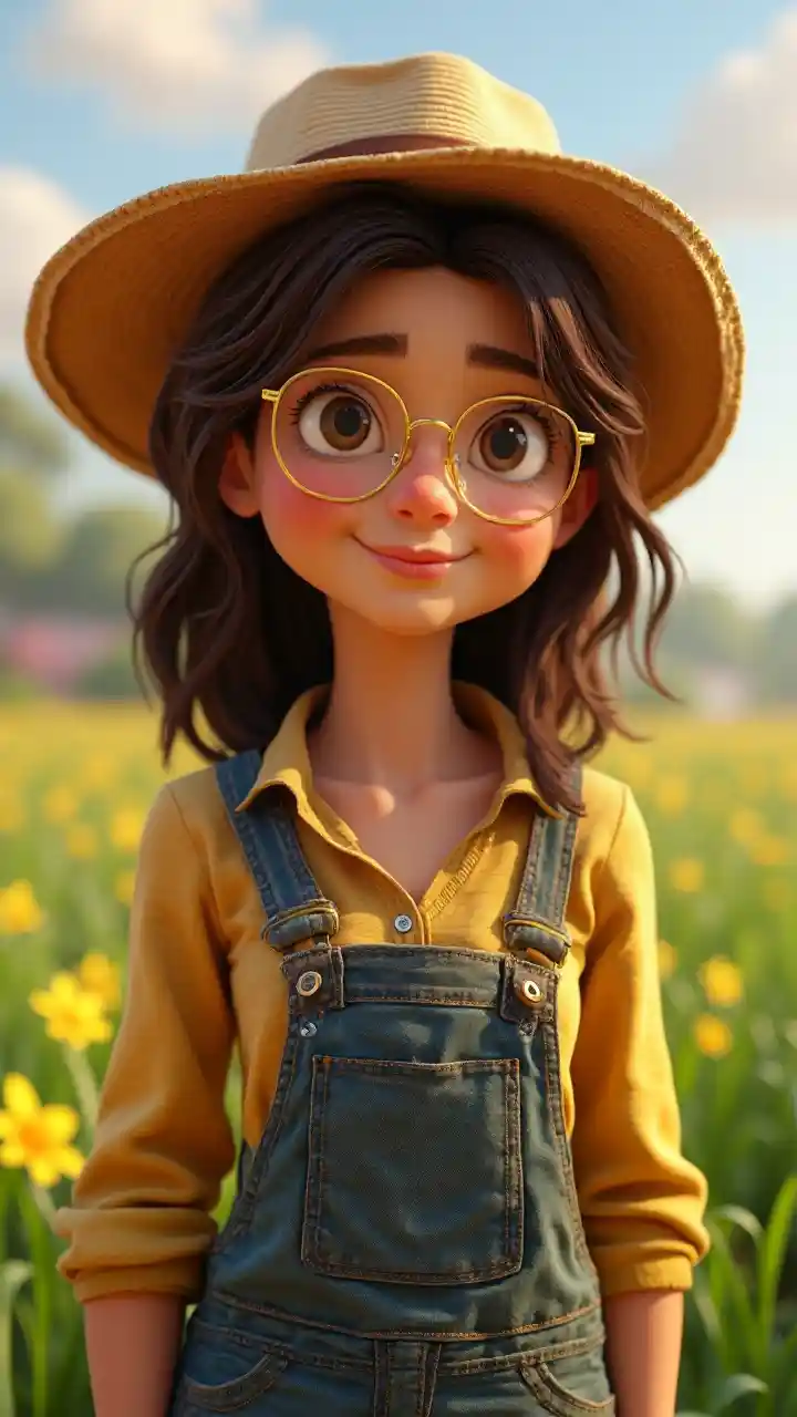 Auroraالمرأة الزراعية ، برونيت ، بشعر متوسط بني داكن مع لمعان لوز ، بنظارة ذهبية ، وجه مستدير ، أنف مستدير ، قبعة فلاح ، ابن 3 سنوات. مورينو ، شعر بني ، أفواه حية على غرار ديزني بيكسار