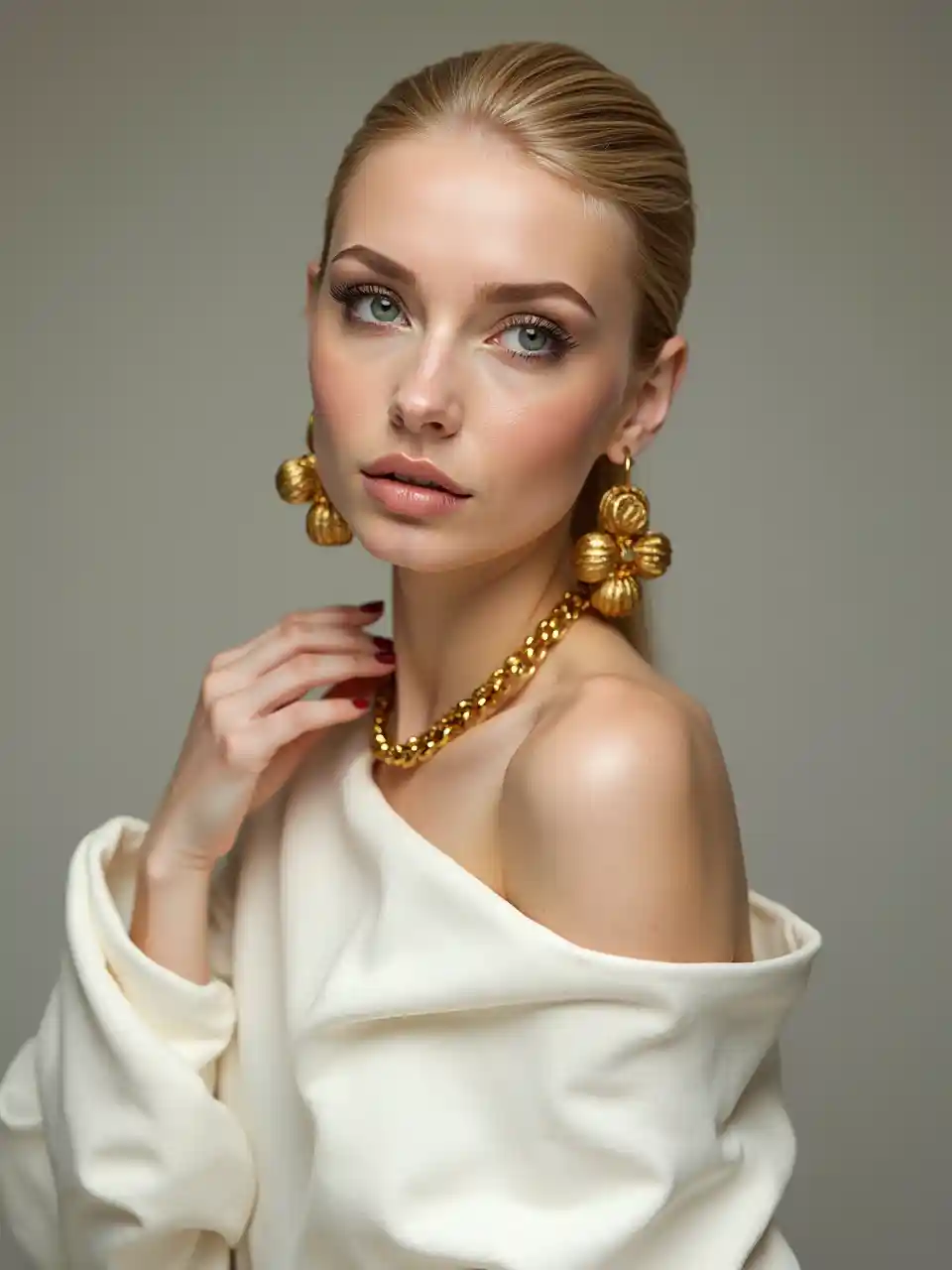**صورة عن قرب فائقة الواقعية وعالية الموضة ، وهي امرأة شقراء جذابة مع شعر ناعم مصقول يتم سحبه إلى الوراء ، مما يكشف عن ملامحها الأنيقة. وارتدت مجوهرات ذهبية فاخرة ، منها أقراط ذهبية فائقة الضخامة مع تصاميم منحوتة ، وقلادة من السلاسل الذهبية الجريئة والمتطورة تنحدر بأناقة فوق عظم الترقوة. ** **كانت يديها ، العارية الآن ، دون قفازات ، موضوعة بأناقة حول خصرها ، مما يؤكد على لفتتها الهادئة والواثقة. كانت أظافرها قصيرة ومصنعة بدقة ، مما أضاف لمسة جمالية متطورة. ووضعت مكياجا ملفتا ورقيقا ، وزادت من جاذبية عينيها الكحل اللامع والرموش الكثيفة والشفاه النود اللامعة. ** **ارتدت قماش أبيض غير متناسق وانسيابي ، بإحساس أنثوي ، ينضح بجمال الرقي والخلود. وكانت الإضاءة ناعمة ومنتشرة ، مما أبرز نعومة بشرتها ، والملمس الفخم لملابسها وإكسسواراتها. الخلفية هي تدرجات محايدة ، الحد الأدنى ، مما يسمح لكل الاهتمام بالتركيز على وجودها الهادئ والأثيري. التصوير الفوتوغرافي التحريري للأزياء الراقية يلتقط كل التفاصيل الدقيقة ، مع التركيز على الجمال الرائع والعصري. **