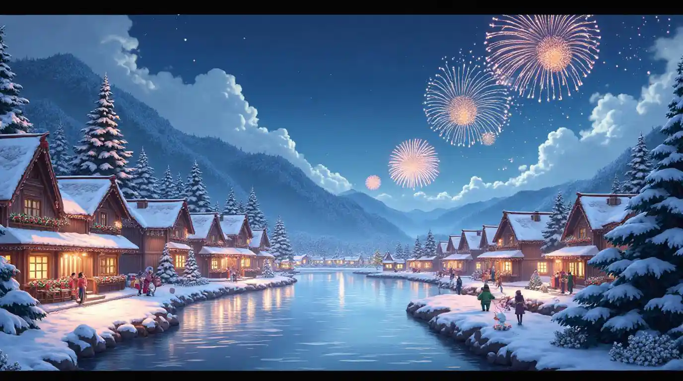 Joannaمهرجان الشتاء في المدينة الساحلية ، موكب التنين من الألعاب النارية ، في نمط الرسوم المتحركة الاحتفالية.