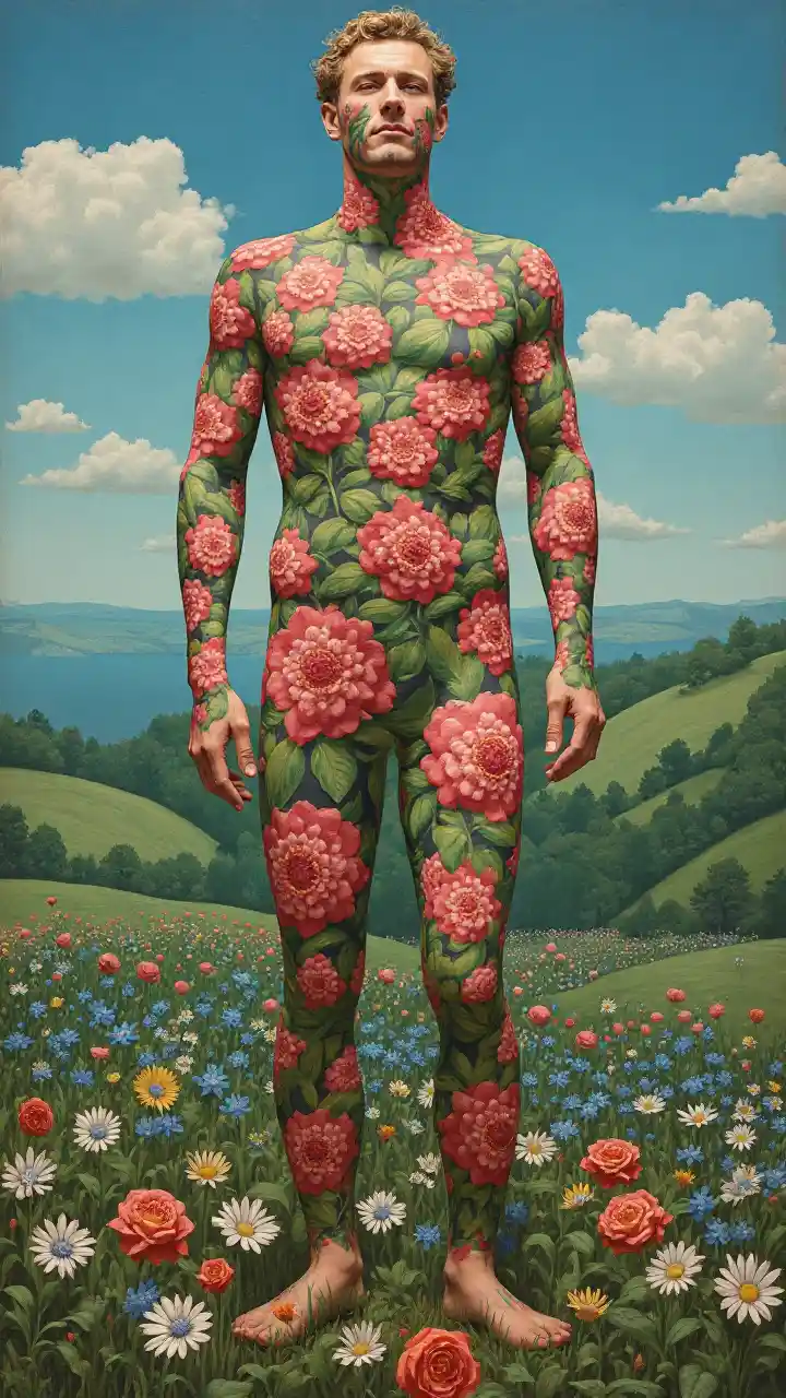 Man with body covered by flowers, painted by rené magritte