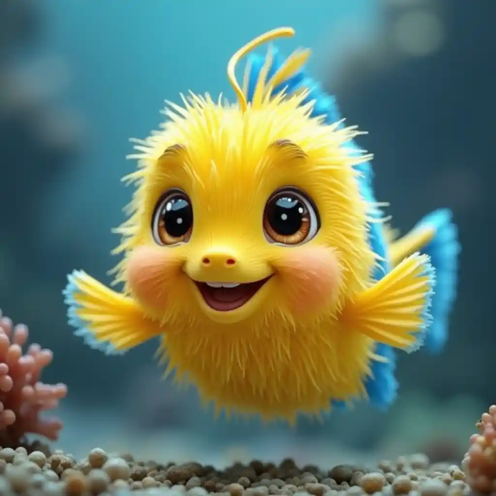 Kittyسمكة صفراء صغيرة جميلة منتفخة مع خطوط زرقاء عليها ، عيون كبيرة ، مبتسمة