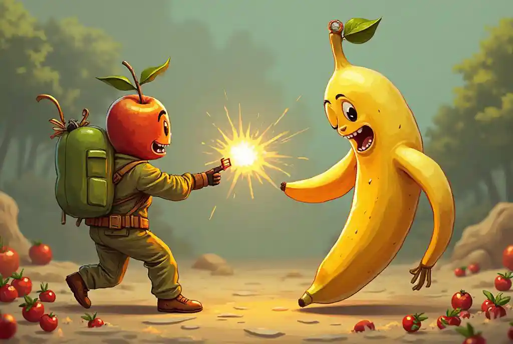جندي فاكهة يلقي قنبلة التفاح على جندي الموز الذي كان على وشك الانفجار.