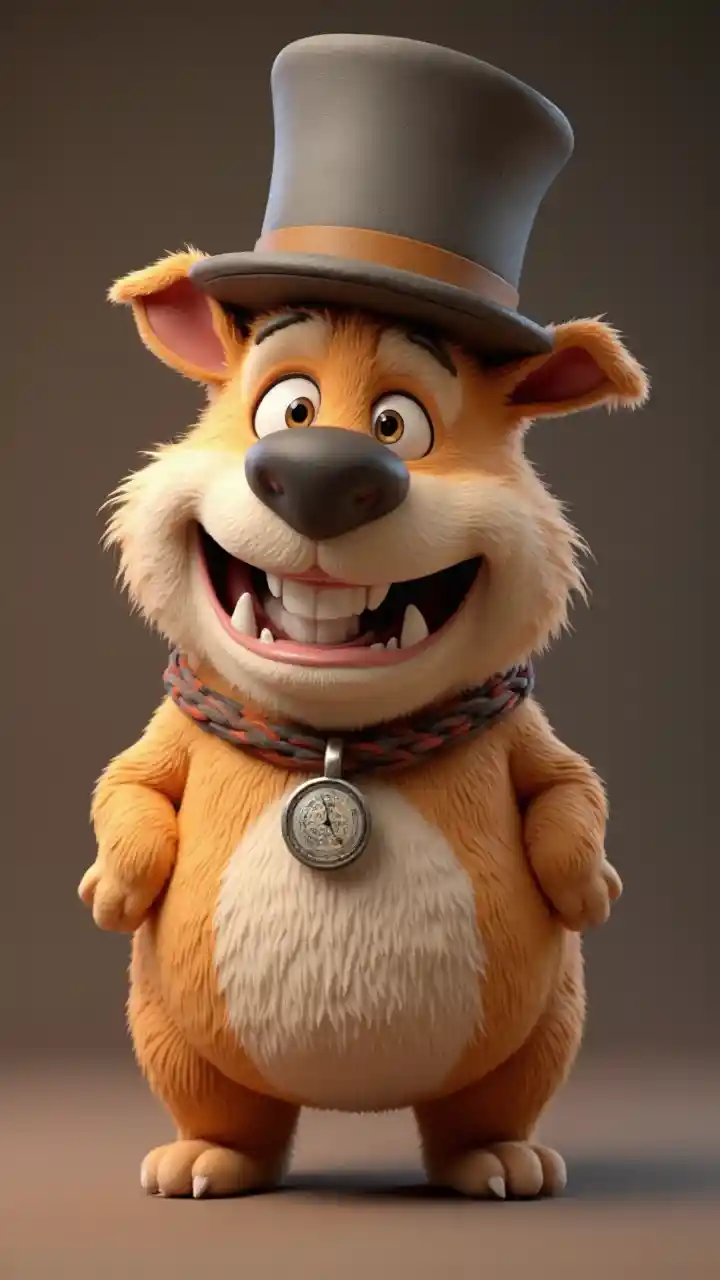 كلب سمين كرتوني ثلاثي الأبعاد مع ابتسامة شقية وقبعة مضحكة