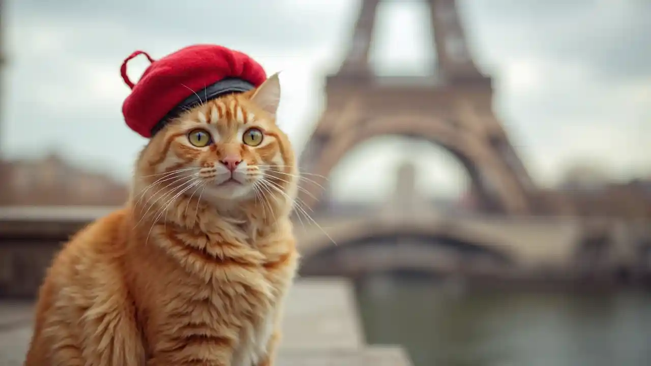 laaaaraقطة الزنجبيل بقبعة حمراء بالقرب من برج إيفل