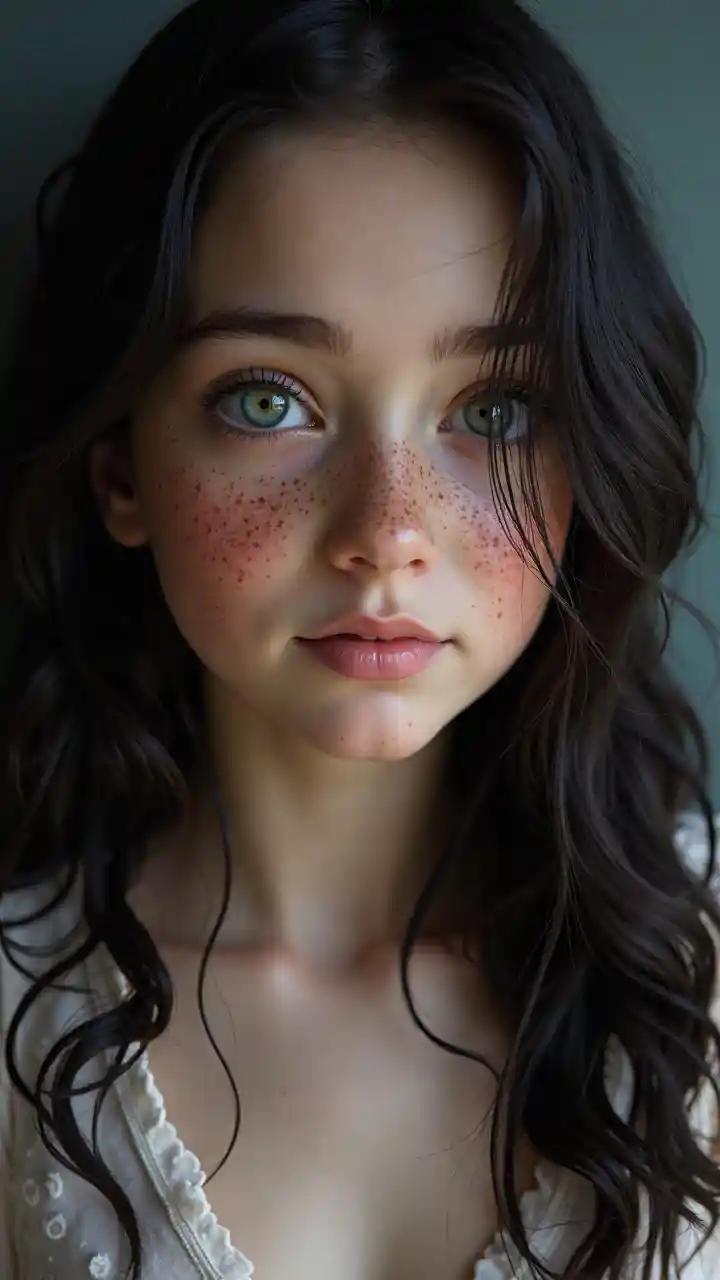 فتاة بيضاء ذات شعر أسود منمش بعيون زرقاء