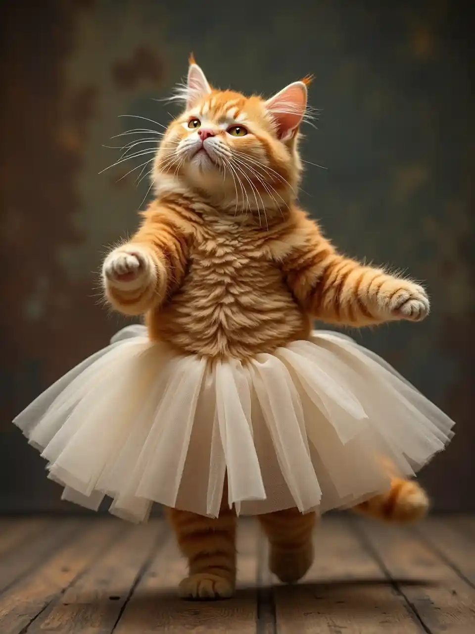 القط الذهبي السمين العملاق يرقص الباليه في فستان الباليه القصير